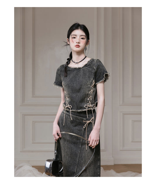 Damaged wash denim set