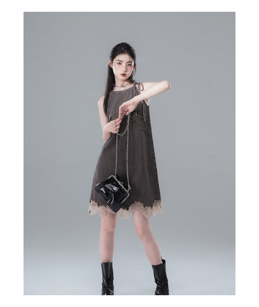 Halter Neck Lace Denim Dress