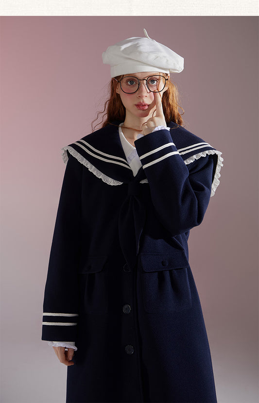 Original design college style navy mid-length wool coat