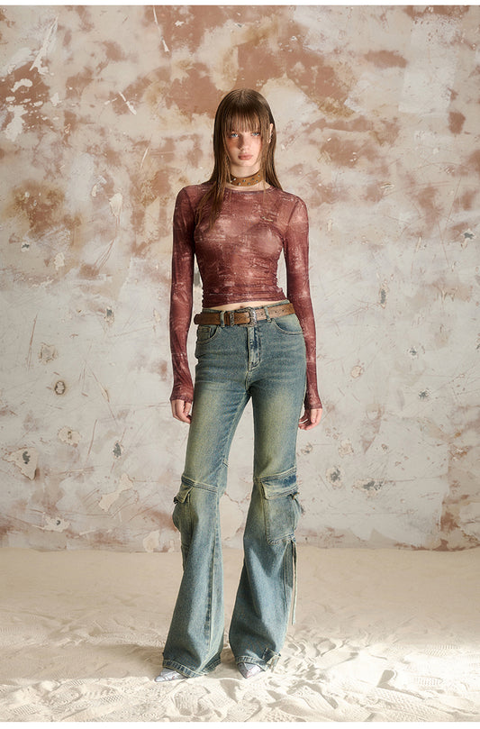 Mesh Printed Slimming Short Slimming Sheer Top Long Sleeve T Shirt