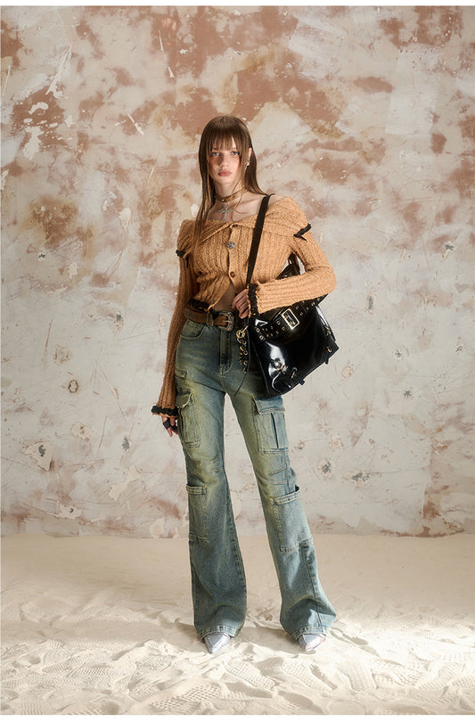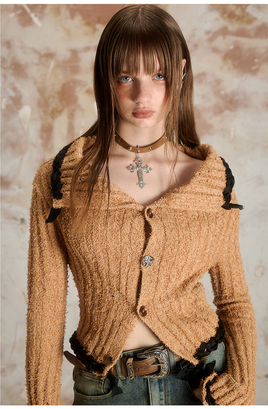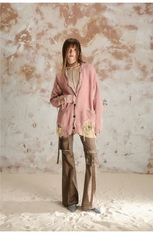 Hot Girl Style Ripped Long Sleeve Top V-Neck Knit Cardigan