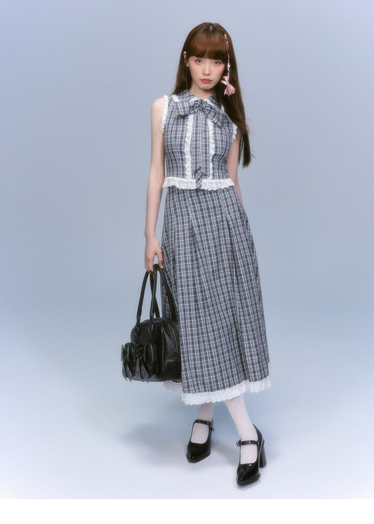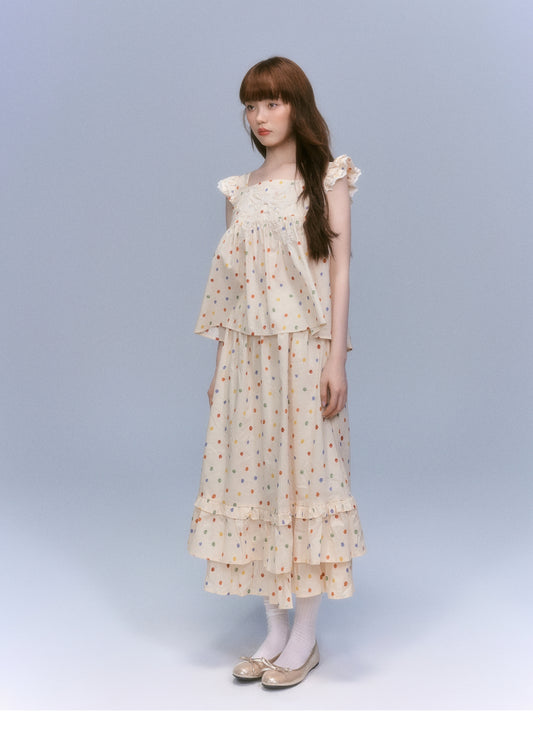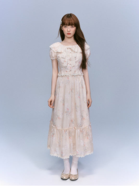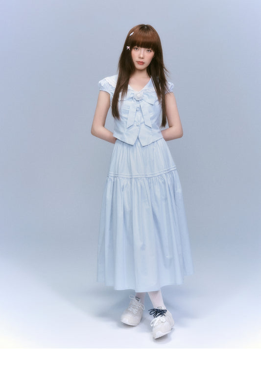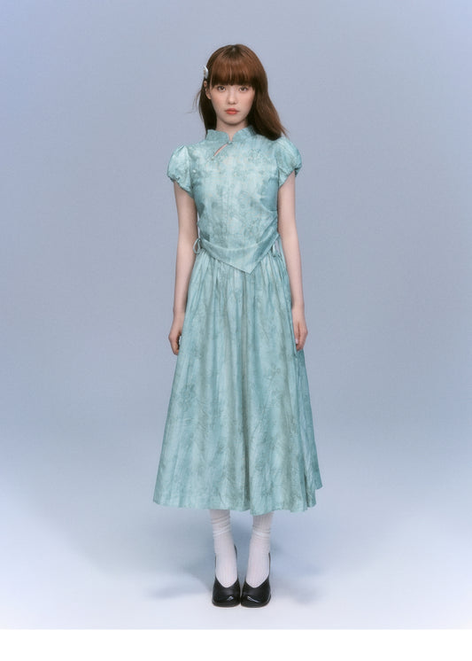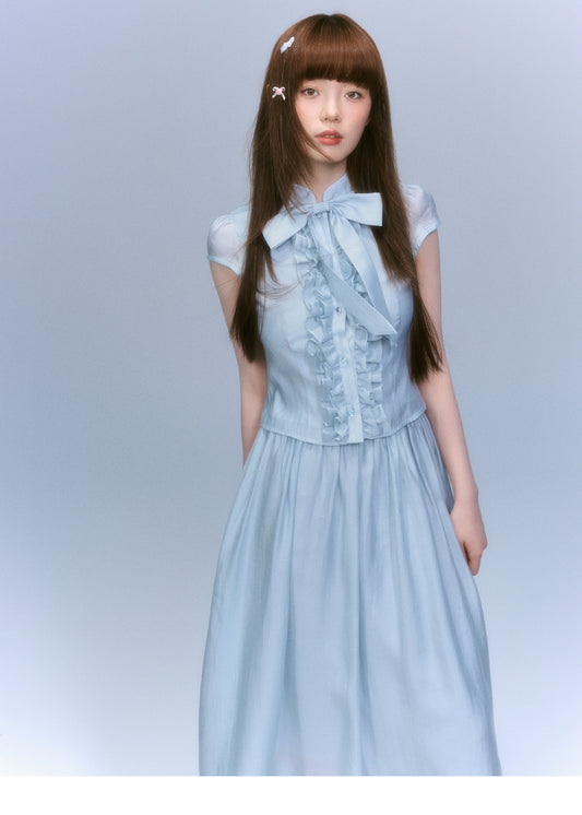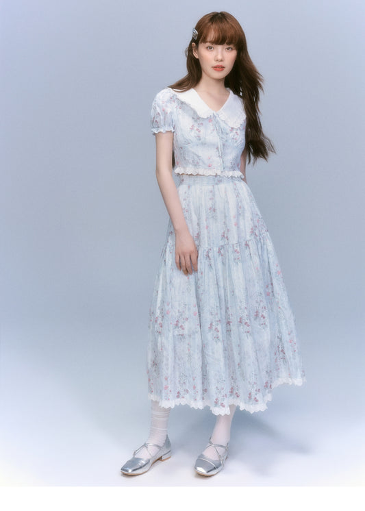 Rose Round Neck Ruffle Blouse & Short Length Skirt Set-Up