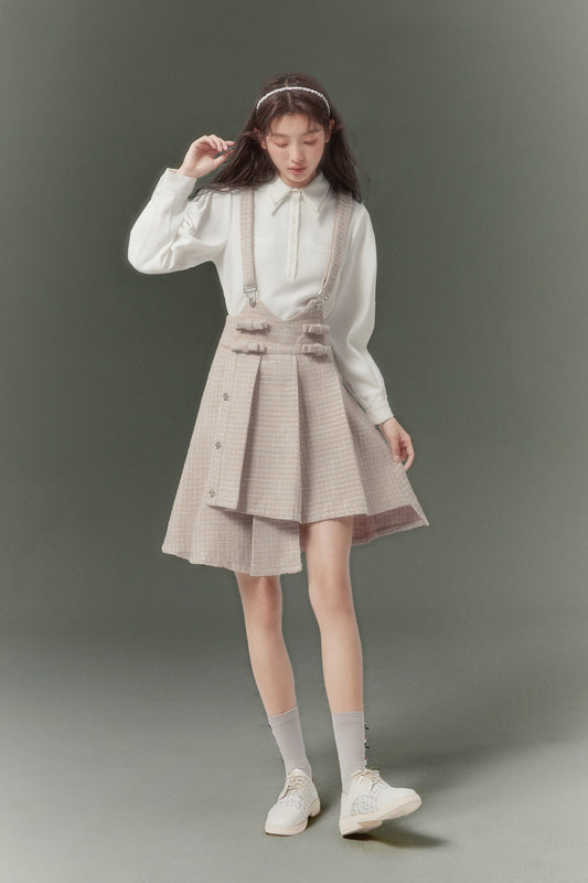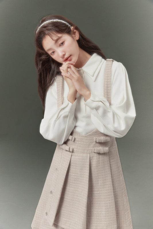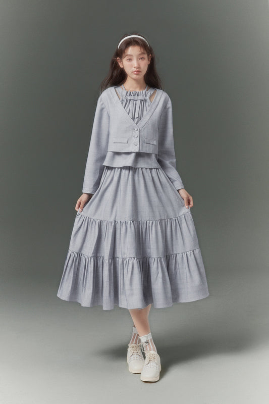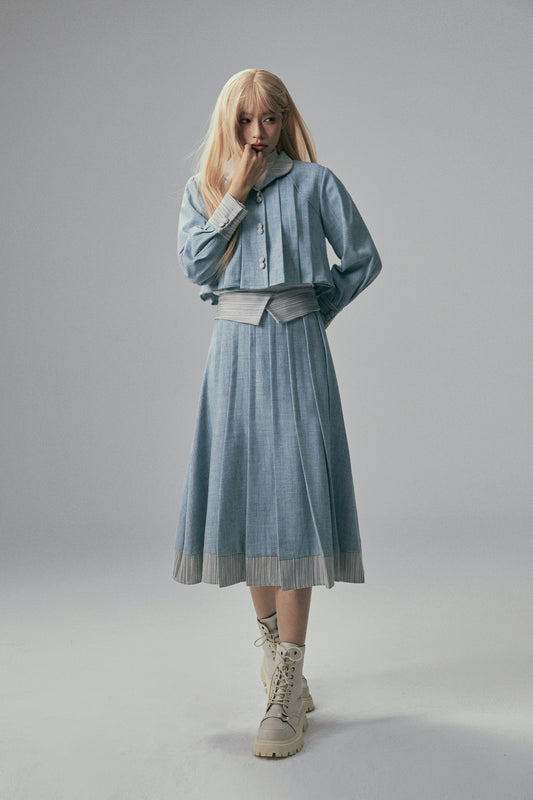 Light Blue Short Cardigan & Double Strap Top Women's Pleated Skirt