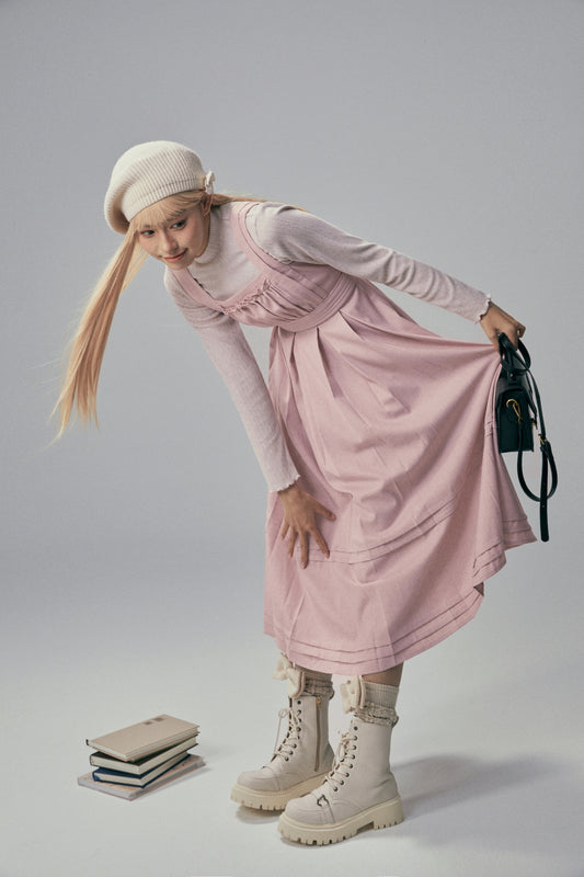 Short Round Neck Long Sleeve Top & Ear Hem Cross Strap Dress