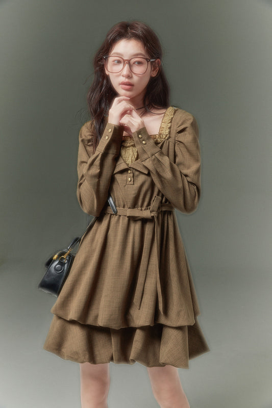 Retro Square Neck Puff Sleeve Belted Waist Double Layer Fake Two Piece Flower Bud Dress