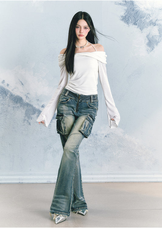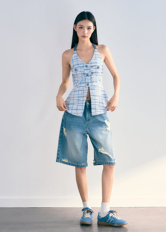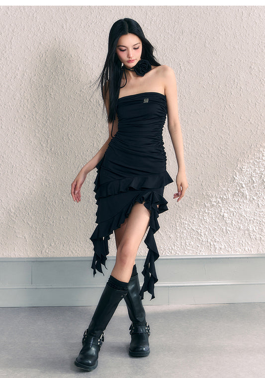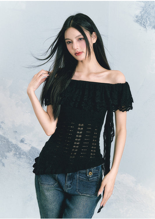 Irregular Design Neck Rose Top & Short Ruffle Denim Skirt