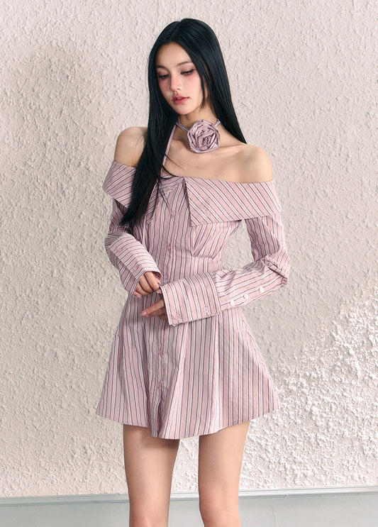 Off-shoulder Striped Long Sleeve Shirt & Short Striped Skirt Set-up