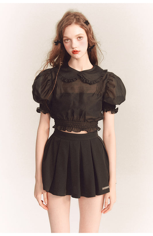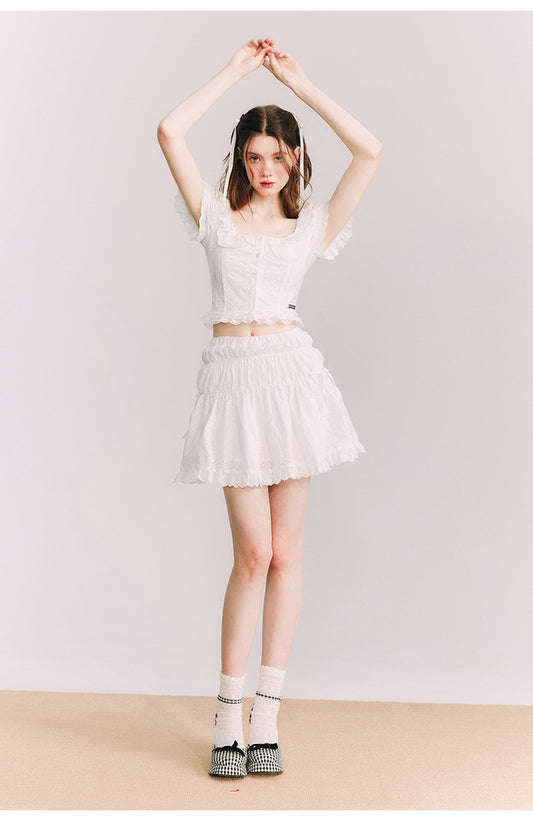 Puff Sleeve Short Length Square Neck Blouse &A -Line Short Skirt