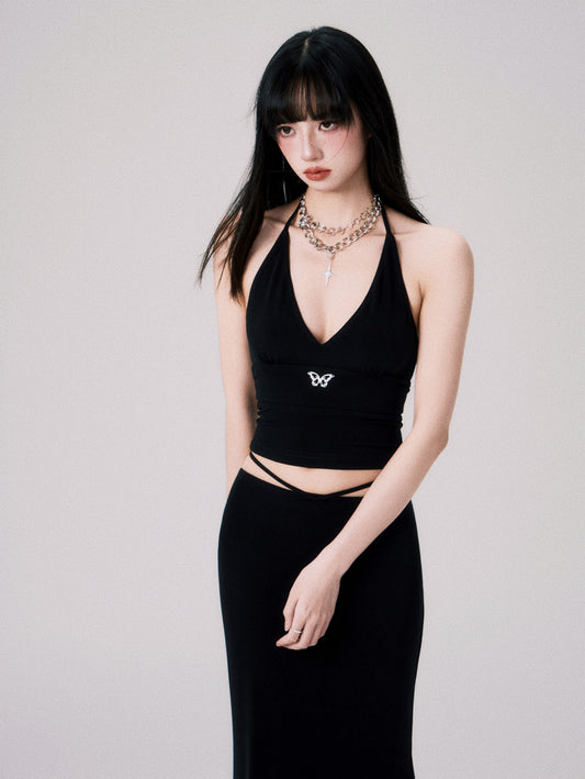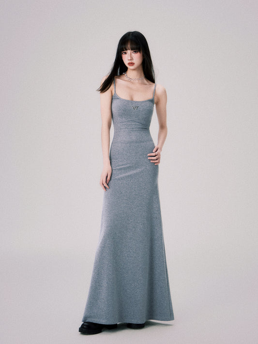 V-neck suspenders & slim long dress setup