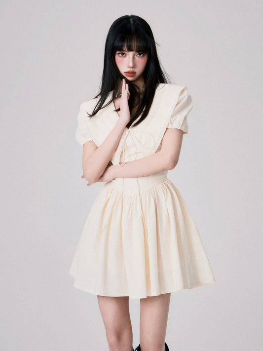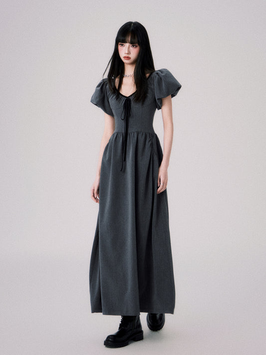 French V-neck Puff Sleeve Ribbon Dress