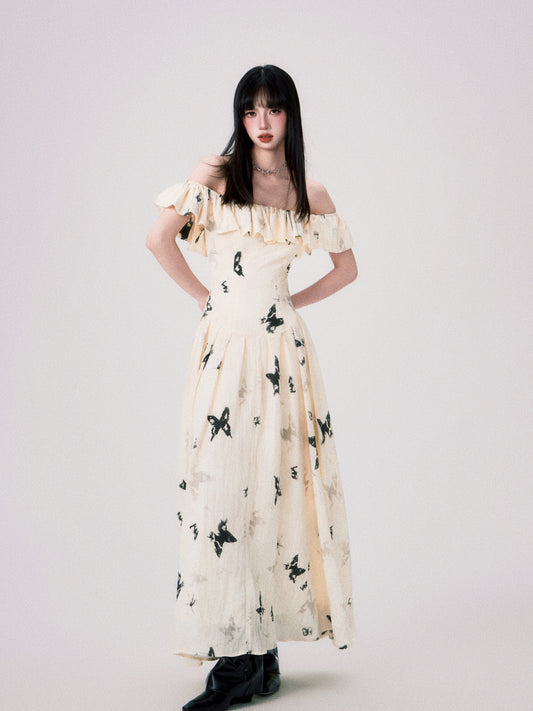 Off Shoulder French Butterfly Print Dress