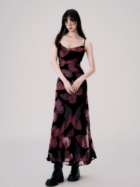 Square Neck Velvet Butterfly Suspender Dress