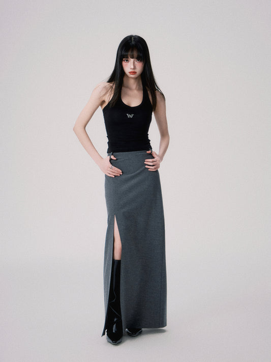 Slim straight mid-waist slit long skirt