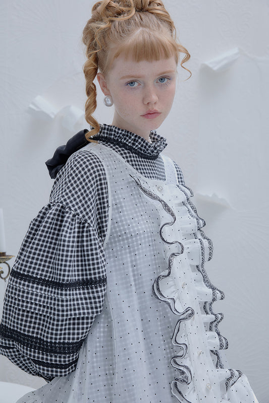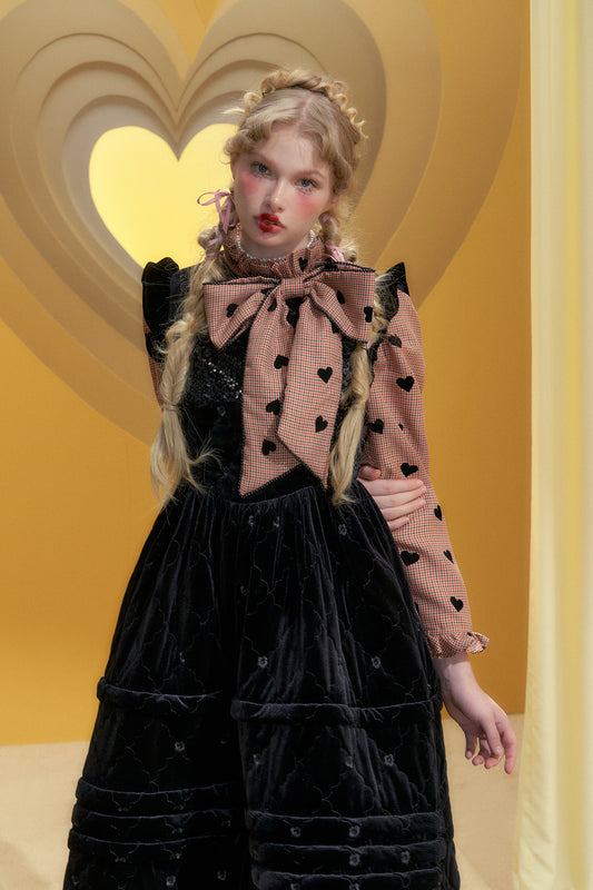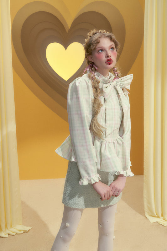 Ribbon pearl pink and green plaid red and black heart puff sleeve shirt