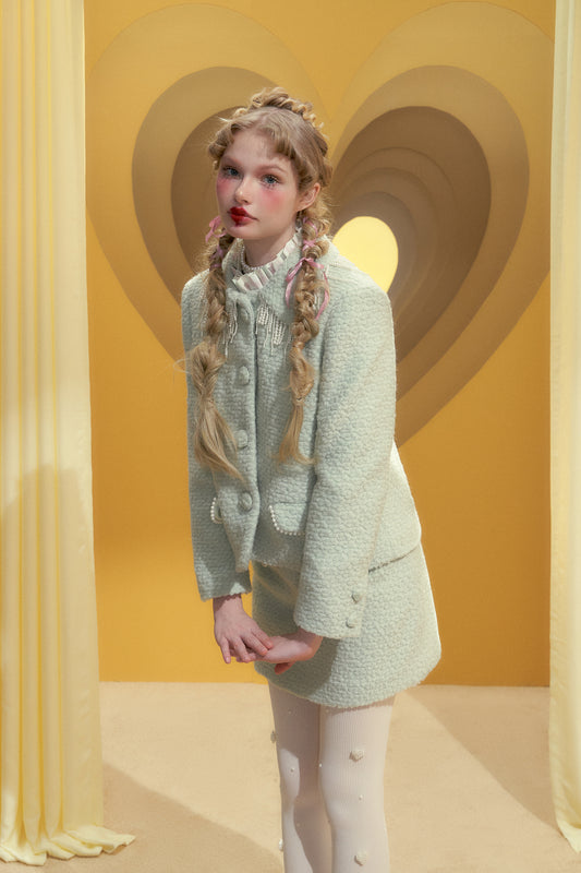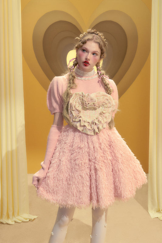 Pink Tweed Layered Love Pearl Embellished Fur High Waist Suspender Skirt
