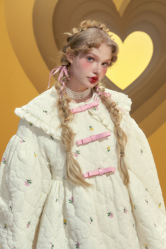 Winter Colorful Floral Embroidery White Loose Mid Length Jacket