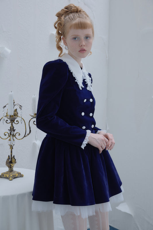 Blue Velvet White Mesh Double Breasted Puff Sleeves Tie Waist Dress