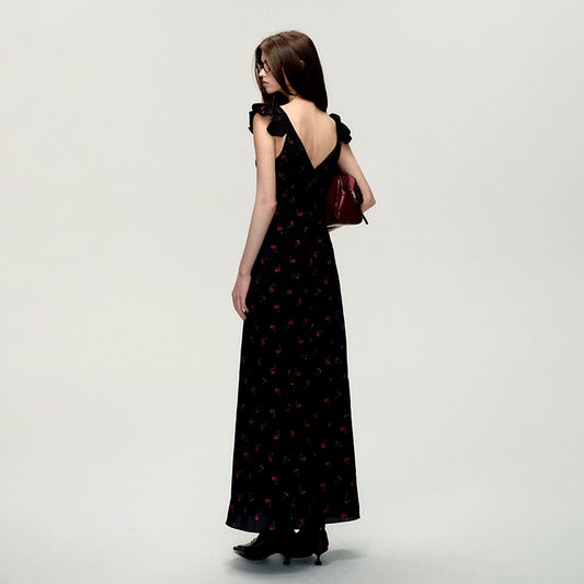 Square Neck Floral Pattern Long Length Ruffle Dress