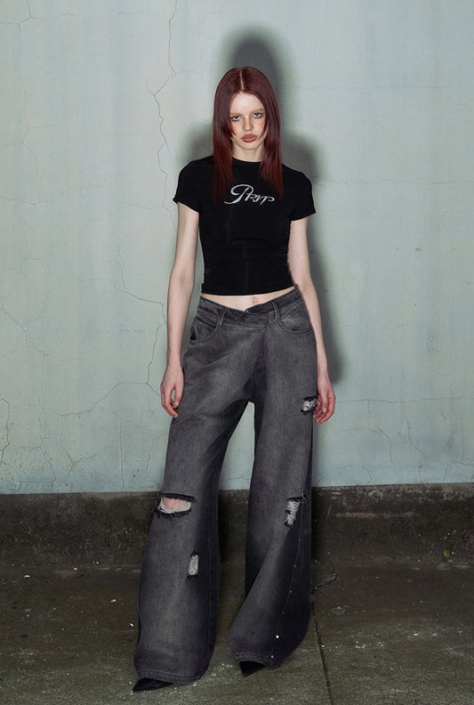 Loose Straight Washed Damaged Denim Pants