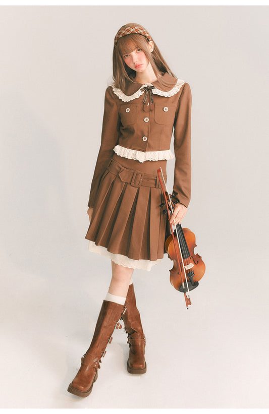 Short Length Frill Neck Jacket & Pleated Skirt Set-Up