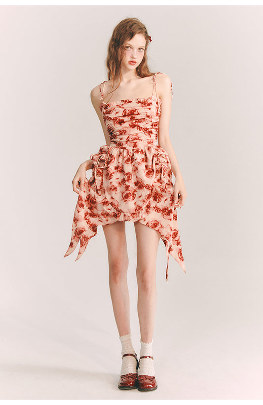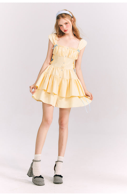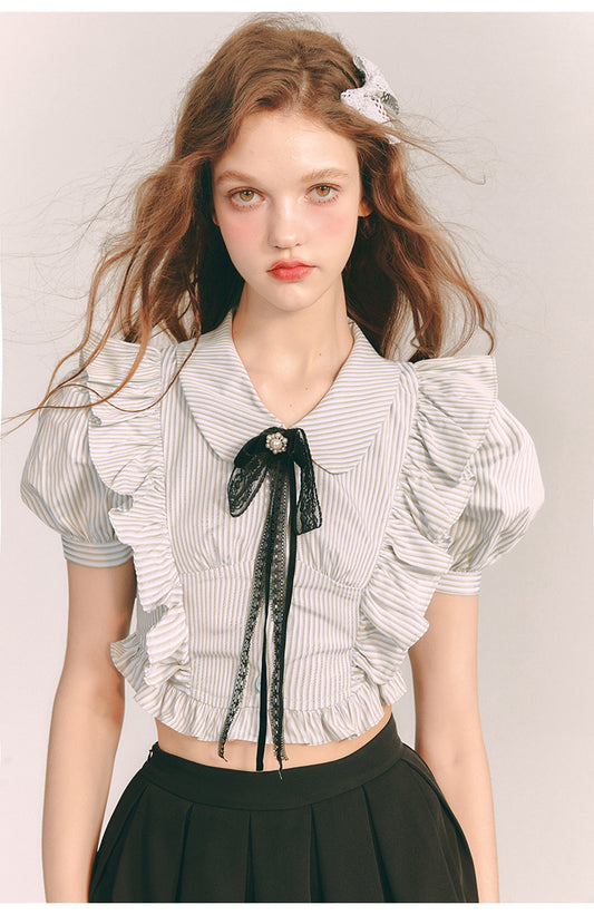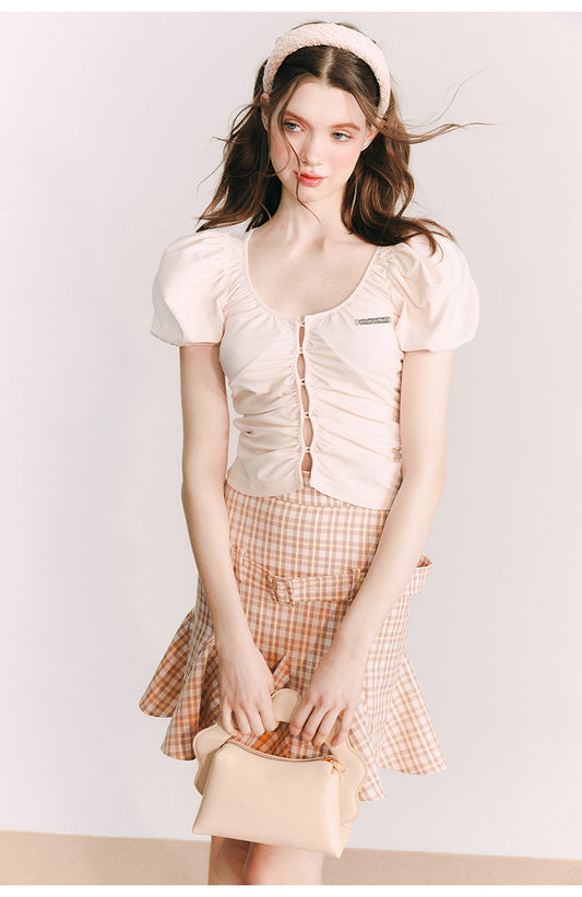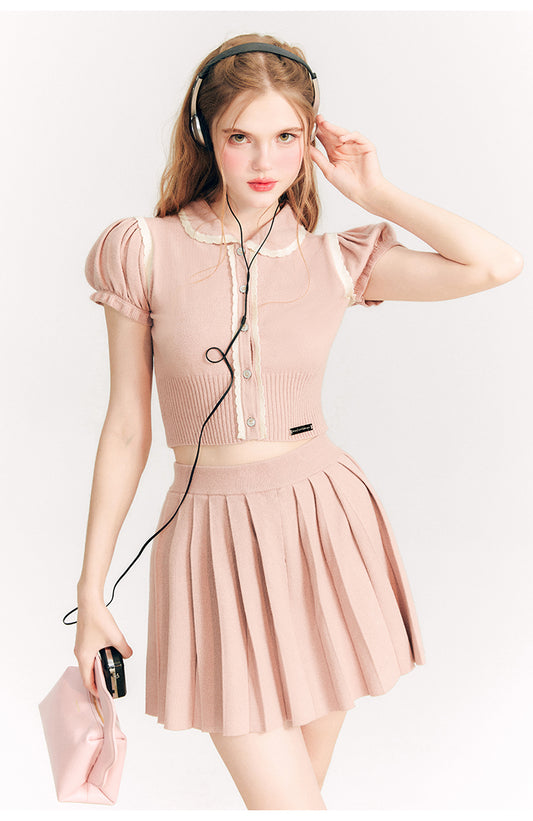 Puff Sleeve Short Length Knit & Pleated Short Length Skirt Setup