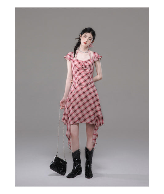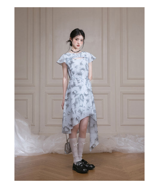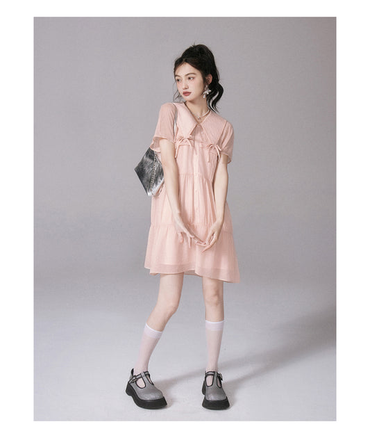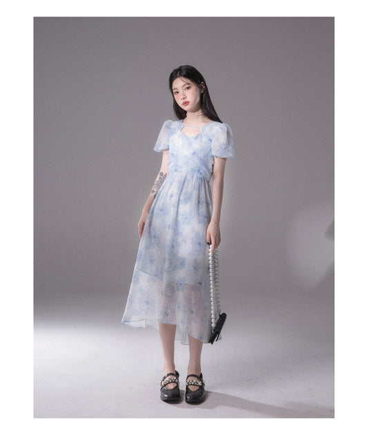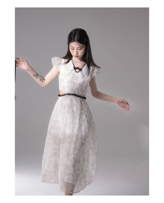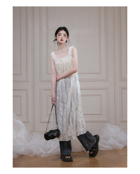 Retro French V-neck Ribbon Long Length Mesh Dress