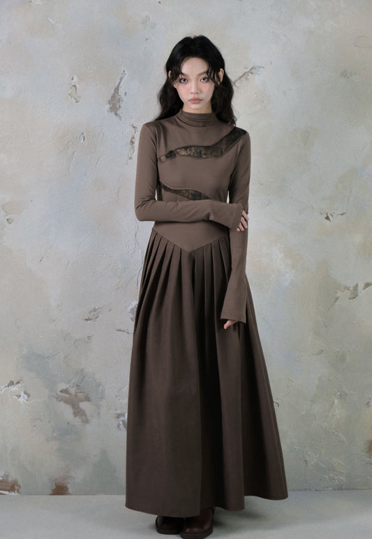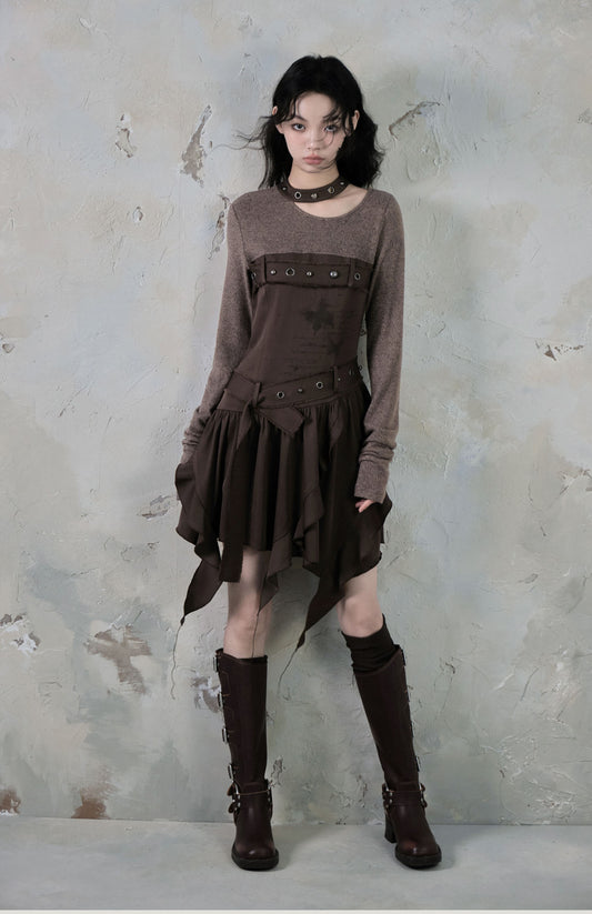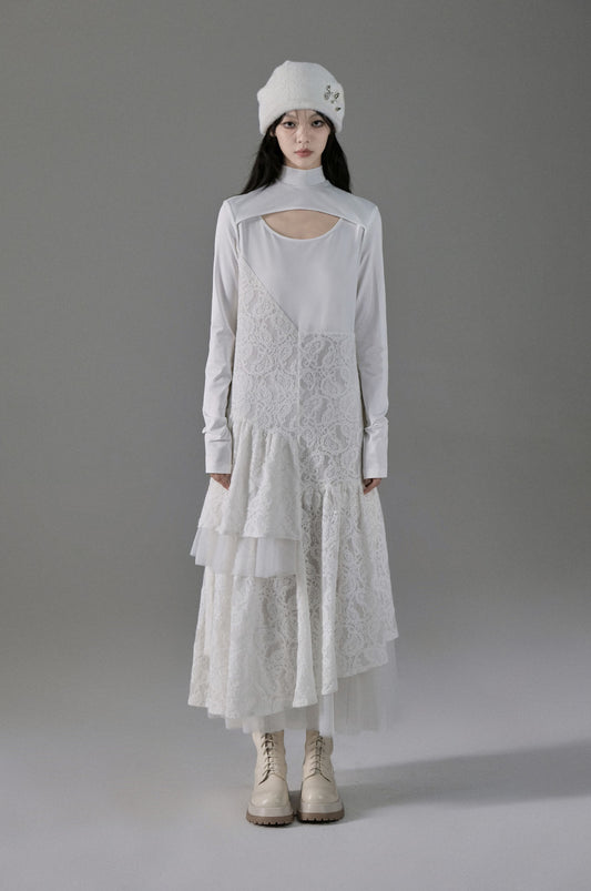 Gentle Style Asymmetric Stitch Hollow Jacquard Long Sleeve Dress