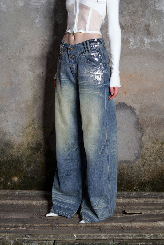 Irregular Waist Wide Straight Washed Denim